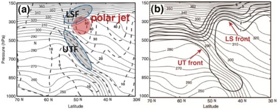 A typical tropopause folding situation as observed on 14 January 1999 at 00 UTC (at 80° W). (a) Potential temperature (solid black lines, K) and zonal wind (dashed black lines, m s−1) and (b) Potential temperature (solid black lines, K) and potential vorticity (thick black contours, PVU). In (a), two regions of enhanced baroclinicity, stability and vertical wind shear are shaded and labeled UTF-upper tropospheric front, and LSF-lower stratospheric front [27]. Adapted from Holton (Figure 6.4. of Ref. [26]).