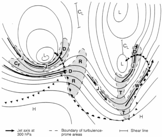 Main CAT-prone areas between 500 and 200 hPa as related to features at 300 hPa. CF is the region of confluence between two jet streams, CL is the upper-air col (turbulence is observed in narrow bands along shear line), D id the diffluent region of jet stream, J is the turbulence associated with the jet-stream on low pressure side, R is the developing upper level ridge, T is the upper level trough, and W is the developing wave low. From Figure 6-2 (a) of Ref. [47]. © British Crown Copyright 1970. Information provided by National Meteorological Library and Archive–Met Office, UK.