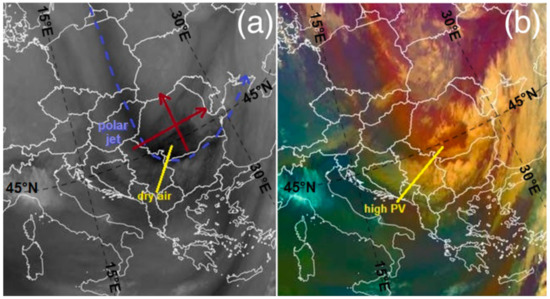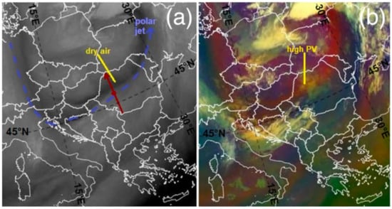 Satellite imagery on 1 April 2018 at 02 UTC: (a) WV 6.2 µm; blue dashed line indicates the position of the polar jet, and the brown arrow is indicating the position for the vertical section shown in Figure 10 and Figure 12; (b) Air Mass RGB (copyright EUMETSAT).
