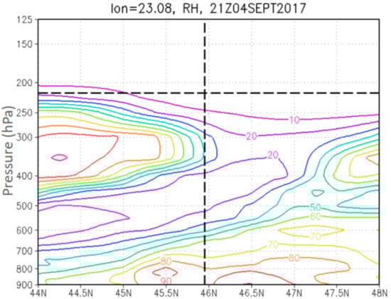 Meridional vertical cross-section of relative humidity (%), at 21 UTC 4 September 2017, through the turbulence report location, as shown by the brown arrows in Figure 3a. The position of the vertical cross section is shown in Figure 3a. The black dashed lines intersection indicates the location of reported turbulence.