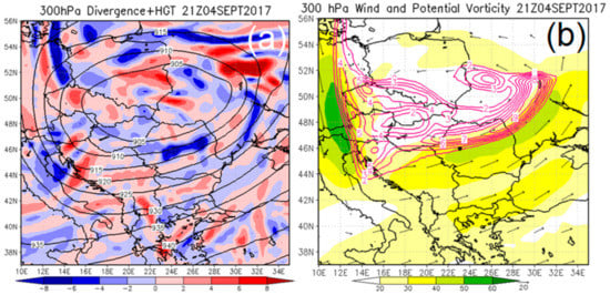 ) and 300 hPa divergence (10−5 s−1) (shaded as indicated on the color bar) at 21 UTC 4 September 2017; (b) 300 hPa potential vorticity (contour every 1 PVU (K m2 kg−1 s−1)) and wind at 300 hPa (, vectors and shaded magnitude as indicated on the color bar), black dot is the location of the turbulence report at 21 UTC 4 September 2017.