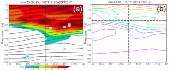 Meridional vertical cross-section through the turbulence report location, as shown by the brown arrow in Figure 3a: (a) PV (PVU, Km2 kg−1 s−1, shaded as indicated on the color bar) and potential temperature (black lines, every 4 °C) at 21 UTC 4 September 2017; (b) ozone mass mixing ratio (ppm) at 21 UTC 4 September 2017. Black dashed lines intersections indicate the location of reported turbulence.
