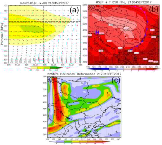 (a) Meridional vertical cross-section through the turbulence report location, of wind speed (ms−1), as shown by the brown arrow in Figure 3a (shaded as indicated on the color bar) and projection of velocity on to the section plan (vertical component scaled to 10−1 Pa s−1) at 21 UTC 4 September 2017. Black dashed lines intersection indicates the location of reported turbulence. (b) Mean sea level pressure (hPa) (black isobars, every 2 hPa) and 850 hPa temperature (°C, shaded as indicated on the color bar, every 3 °C) at 21 UTC 4 September 2017. H–high pressure, L-low pressure and colored are the atmospheric fronts (blue is cold front, red is warm front, and purple is occluded front); (c) Deformation field at 225 hPa level (10−5 s−1) shaded as indicated in the color bar. Black dot is the location of the turbulence report at 21 UTC 4 September.