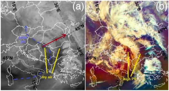 Because the tropopause fold marks the change in the height of the dynamic tropopause and describes the downward intrusion of stratospheric air characterized by high PV and low humidity into the troposphere, on the satellite imagery (i.e., WV imagery) it is marked by gradients in the upper-level moisture. Thus, for satellite data, the algorithm uses the Spinning Enhanced Visible and Infrared Imager (SEVIRI) 6.2 µm channel which is sensitive to upper tropospheric water vapor (WV 6.2 µm), SEVIRI IR channel at 9.7 µm (very useful for ozone detection) and SEVIRI IR 10.8 µm. Another algorithm that uses satellite data is that from NOAA NESDIS–Center for Satellite Application and Research Algorithm version 2.0 [30]. This has been developed to provide a prediction of turbulence associated with tropopause folding (Tropopause Folding Turbulence Prediction, TFTP) [36] and thus to indicate turbulent flight conditions for aircraft. The gradients in WV channel of the Advanced Baseline Imager flown on the GOES-R, are used as an indication of the distribution of folds. A NWP model is then used to constrain these features vertically in the atmosphere. The algorithm provides the lower and upper bounds of the tropopause folds. Once found, vertical boundaries indicate the vertical width of the atmospheric layers prone to tropopause fold-induced CAT. Based on the above, the study used a subjective identification of tropopause folds by the examination of SEVIRI 6.2 µm WV channel imagery.