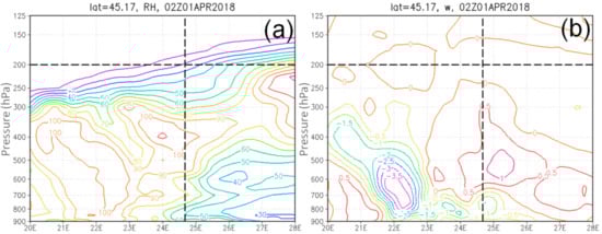 Meridional vertical cross-section in (a) relative humidity (%), and (b) vertical velocity magnitude (Pa s−1) at 02 UTC 1 April 2018. The position of the vertical cross section is shown in Figure 9a (brown arrow). The black dashed lines intersection indicates the location of reported turbulence.
