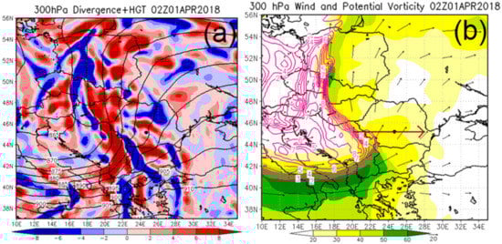 ) and 300 hPa divergence (10−5 s−1) (shaded as indicated on the color bar) at 02 UTC 1 April 2018, and (b) 300 hPa potential vorticity (contour every 1 PVU (K m2 kg−1 s−1), and wind at 300 hPa (m s−1) (vectors and shaded magnitude as indicated on the color bar). Black dot is the location of the turbulence report and the brown arrow is for vertical cross-section of Figure 12 at 02 UTC 1 April 2018.