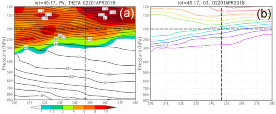 Zonal vertical cross-section through the turbulence reports location, as shown by the brown arrows in Figure 11b: (a) PV (PVU, Km2 kg−1 s−1), shaded as indicated on the color bar) and potential temperature (black lines, every 4 °C) at 21 UTC, 1 April 2018, black dashed lines intersection indicate the location of reported turbulence; (b) ozone mass mixing ratio (ppm) at 21 UTC, 1 April 2018.
