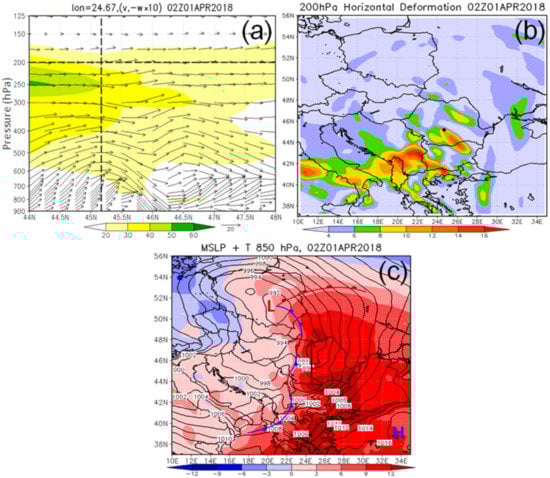 (a) Meridional vertical cross-section of the wind speed (m s−1), through the turbulence report location as shown by the brown arrows in Figure 11b (shaded magnitude as indicated on the color bar, every 10 m s−1) and projection of velocity on to the section plan (vertical component scaled to −10−1 Pa/s) at 02 UTC 1 April 2018. (b) Deformation field at 200 hPa level (10−5 s−1) shaded as indicated in the color bar; (c) Mean sea level pressure (hPa) (black isobars, every 2 hPa) and 850 hPa temperature (°C, shaded as indicated on the color bar, every 3 °C). H—high pressure, L—low pressure and colored are the atmospheric fronts (blue is cold front, red is warm front, and purple is occluded front; black arrow is for vertical section shown in Figure 13b Black dot is the location of the turbulence report at 02 UTC 1 April 2018.