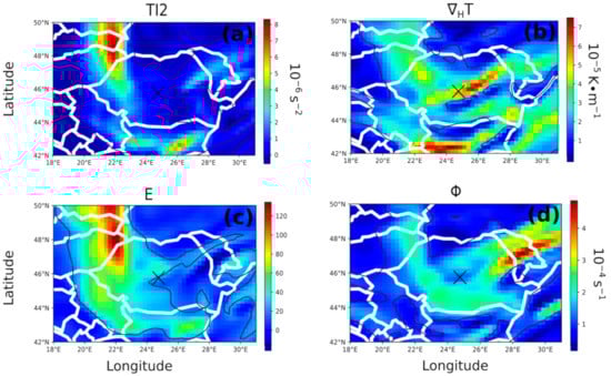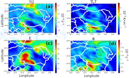 Figure 8 depicts the four turbulence indices fields over Romania for the 4 September 2017 at 21:00 UTC. On the one hand, over the region of interest, both TI2 and E show values well below the severe turbulence thresholds (Table 2). On the other hand, exceeds the severe threshold value, indicating turbulence producing conditions within a delimited continuous SW–NE orientated band. The Brown index (Φ) suggests a wider area of turbulence comprising the entire northern region (Figure 8d). These results are in agreement with the presence of a frontal zone in the upper troposphere (Figure 6a), on a rearward sloping cold front moving to south-east (Figure 7b) and also with a band of high cyclonic relative vorticity poleward of the SW-NE orientated jet stream (Figure 5b and Figure 7a); the latter corresponds to the potential vorticity anomaly within the tropopause fold (Figure 5b).