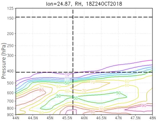 Meridional vertical cross-section of relative humidity, through the turbulence reports location as shown by the brown arrow in Figure 15a at 18 UTC 24 October 2018. Dashed lines intersection indicates the locations of the upper turbulence reports.