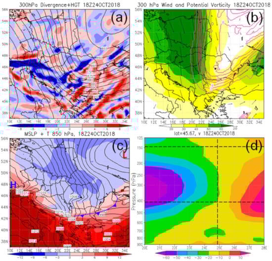 ) and 300 hPa (divergence, 10−5 s−1) shaded as indicated on the color bar) at 18 UTC 24 October 2018; (b) 300 hPa potential vorticity (contour every 1 PVU (K m2 kg−1 s−1)), and wind at 300 hPa (m s−1, vectors and shaded magnitude as indicated on the color bar) at 18 UTC 24 October 2018; (c) Mean sea level pressure (MSLP, hPa, black isobars, every 2 hPa) and 850 hPa temperature (°C, shaded as indicated on the color bar, every 3 °C) at 18 UTC 24 October 2018. H–high pressure, L-low pressure and colored are atmospheric fronts (blue is cold front, red is warm front, and purple is occluded front); (d) Vertical zonal cross -section of the meridional wind component v (m s−1), through the turbulence reports location as shown by the brown arrow in Figure (shaded as indicated on the color bar).