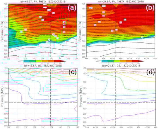 Vertical zonal (left) and meridional (right) cross-section through the turbulence reports location as shown by the brown arrows in Figure 15a: (a) and (b) of potential vorticity (PVU, K m2 kg−1 s−1), shaded as indicated on the color bar) and potential temperature (°C, solid lines), and (c) and (d) ozone mass mixing ratio (ppm) at 18 UTC 24 October 2018. The black dashed lines intersections indicate the locations where the pilots reported turbulences.
