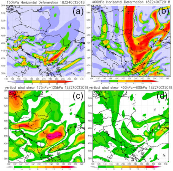 The maximum wind speed at 200 hPa (the altitude of the reported turbulence) clearly shows the upper trough stretching NE-SW over north-western Romania, wind speed exceeding 40 m s−1 above the reported point (Figure 5b and Figure 7a). The color gradient (yellow to green) shows a significant amount of both horizontal and vertical wind shear, implying that turbulence can result.