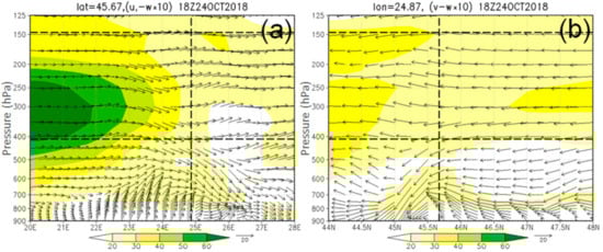 Zonal (a) and meridional (b) vertical cross-section of wind speed (m s−1), through the turbulence reports location as shown by the brown arrows in Figure 15a (shaded as indicated on the color bar) and projection of velocity on to the section plan (vertical component scaled to −10−1 Pa/s) in the direction of brown arrow from Figure 15a; black dashed lines intersection indicate the location of the upper turbulence reports at 18 UTC 24 October 2018.