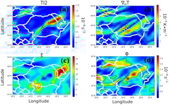 (a) Ellrod 2 (TI2), (b) temperature horizontal gradient (