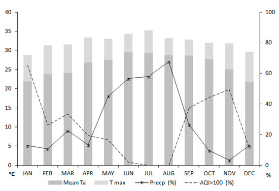 Kaohsiung is not only the largest city with the highest population in southern Taiwan, but it is also a sunny city with over 2400 sunshine hours annually. The 2019 monthly mean air temperature (Ta), highest temperature (T max), the percentage of precipitation (Precp), and the percentage of having an Air Quality Index (AQI) >100 of Kaohsiung City are shown in Figure 1.