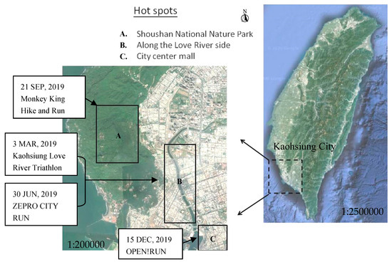 In this study, we chose travel hot spots where thousands of visitors gather on weekends or holidays in Kaohsiung. Shoushan National Nature Park, Love River, and the city center mall were selected as the focus areas, as shown in Figure 2. To better understand the assessment of the thermal environment and air quality in hot-humid regions, there were four running events held at those hot spots in March, June, September, and December, 2019, respectively, which were selected as cases for analyzing the seasonal thermal and air condition in Kaohsiung. These four running events are described in detail in Section 3.