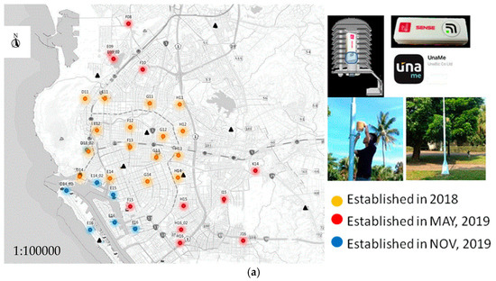 The Building and Climate Lab (BCLab) at the National Cheng Kung University (NCKU) has established the Smart Temperature and Environment Observation Network in Kaohsiung (STONK), as shown in Figure 3a. Since 2018, there have been 34 monitoring sites among travel spots, busy streets, and parks in the Kaohsiung urban area. We used UnaSense sensors from UnaBiz SigFox to monitor the air temperature (detection range −20~70 °C, with ±1 °C accuracy) and relative humidity (detection range 0~100%, with ±2% RH accuracy) among all 34 sites. Sensors for the IoT (Internet of Things) were applied and installed 2~2.5 m above the ground at each site for better sensing of the environmental conditions at the pedestrian scale.
