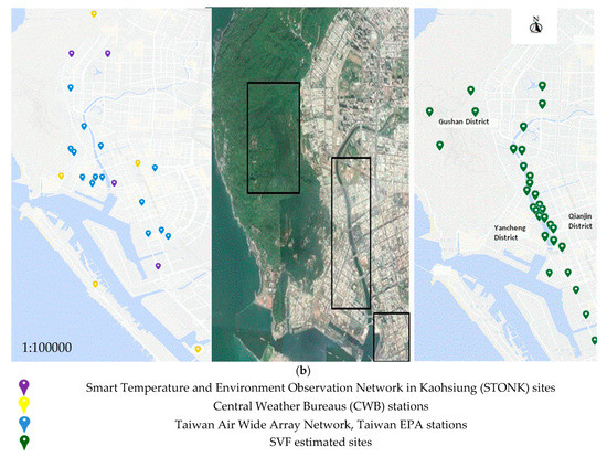 As seen in Figure 3b, in this study, the data we applied included real time air temperature and relative humidity data from four STONK stations; real time wind speed and solar radiation data from five Central Weather Bureaus (CWB) stations; real time PM2.5 concentration data from 14 stations of the Taiwan Air Wide Array Network, Taiwan EPA; and SVF estimated at 31 sites via GSV2SVF—an interactive GIS tool [20]. GSV2SVF transformed Google Street View (GSV) images into fisheye images. With fisheye images, we could estimate sky/tree/building view factors and then calculate the SVF.