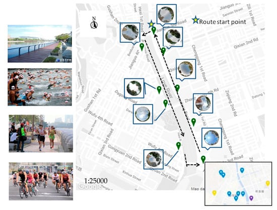 The Kaohsiung Love River Triathlon is an annual event with a longstanding reputation among sports enthusiasts; the previous one was held on 3 March 2019. With a large number of participants, this event was selected as the spring running event in this study. Three types of exercising modes, namely swimming, cycling, and running, were included in the triathlon, and here we only took the running schedule during 8:30 a.m.–10:30 a.m. into consideration in analyzing the thermal and air quality conditions for runners and walkers. We also analyzed the conditions from 6:30 a.m.–10:30 a.m. for walkers. The route, activity photos, and the fisheye photos obtained from nine sites are shown in Figure 4.