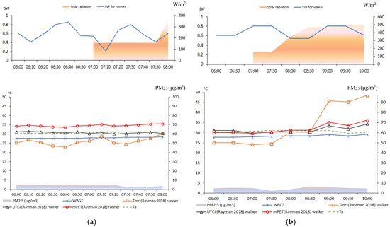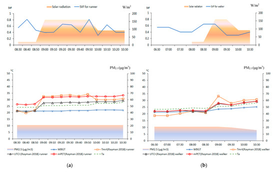 For planning a running event, it was essentially very important to decide the route and running schedules for different running groups (42 km, 21 km, 10 km, 6 km, and so on) [38]. In this study, with the fisheye photos taken at sites along with the route for those events, it was possible to calculate the accurate and detailed SVF at different parts of the route. There was not much we could do to change the solar radiation from the source, but SVF could be significantly important in adjusting the final influences. In this study, the SVF was assumed to be the same during each 10 min duration for runners and 30 min duration for walkers. Furthermore, the mPET correlations with solar radiation and SVF for runners/walkers are shown in Figure 14a,b.