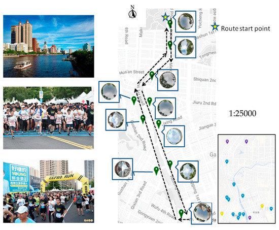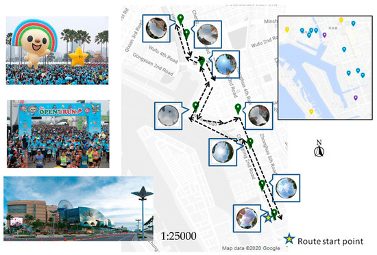 The ZEPRO City Run held on 30 June 2019 was a charity run event supported by a local company promoting the marathon, and which had been hosting annual running events among several cities since 2016. Up until 2020, there had been more than 200 thousand participants joining the events. This could be viewed as one of the most successful running events in popularizing both exercise and healthy life styles in Taiwan. Thus, it was selected as the summer running event in this study. Here, we took the running schedule from 6:00 a.m. to 8:00 a.m. into consideration for analyzing the thermal and air quality condition for runners. Moreover, we also analyzed the conditions from 6:00 a.m. to 10:00 a.m. for walkers. The route, activity photos, and the fisheye photos took from 10 sites are shown in Figure 6.