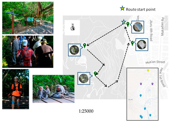 The Kaohsiung Shoushan mountain area has been viewed as one of the hot spots for local citizens to relax and get close to the forest and greenspace. According to the statistical information provided by the Kaohsiung Tourism Bureau, there were more than 660 thousand individuals visiting the Shoushan mountain area in 2019. Therefore, the Monkey King Hike and Run held at the Shoushan mountain area on 21 September 2019 was selected as the autumn running event in this study. Here, we took the running–hiking schedule of 6:00 a.m.–8:00 a.m. into consideration in analyzing the thermal and air quality conditions for runners. We also analyzed the conditions from 6:00 a.m. to 10:00 a.m. for walkers. The route, activity photos, and the fisheye photos taken from four sites are shown in Figure 8.