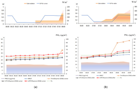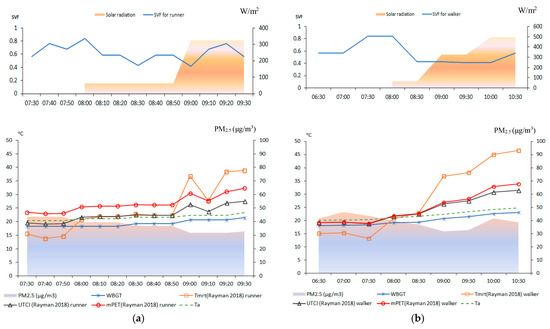 In Figure 9a, there was very little solar radiation until 7:00 a.m., and the value gradually increased from 53 W/m2 to 208 W/m2 by the end of the running and hiking process. With the shade offered by the trees in the mountain area, SVF values from 6:20 a.m. to 7:10 a.m. were between 0.088 and 0.095, an increase of less than 0.1. The distribution for all thermal indicators had generally quite steady and smooth trends, along with a PM2.5 concentration around 26 μg/m3 as a moderate condition, which indicated that both thermal and air quality conditions could be viewed as low risk in causing thermal discomfort for runners.