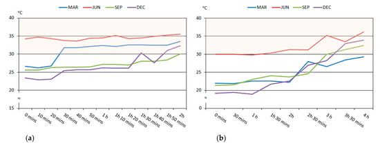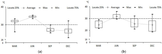 For both runners and walkers, the highest peaks of average/max/min mPET all occurred at the summer event, as seen in Figure 13a,b. It was also shown that the mPET values were more evenly dispersed for walkers than for runners. By defining mPET over 30 °C as the threshold in feeling thermal discomfort for people in Taiwan, runners would feel too hot for most of the time (between locate 25~75%) in spring and summer events while walkers would feel too hot for most of the time only at summer events. Nevertheless, even walkers would feel quite comfortable for the most of the time in spring, autumn, and winter. Regarding the max mPET over 30 °C taking place, walkers would still have to face conditions of discomfort from time to time. In general, autumn running event would be viewed as safest in avoiding thermal discomfort for runners, and spring events for walkers.