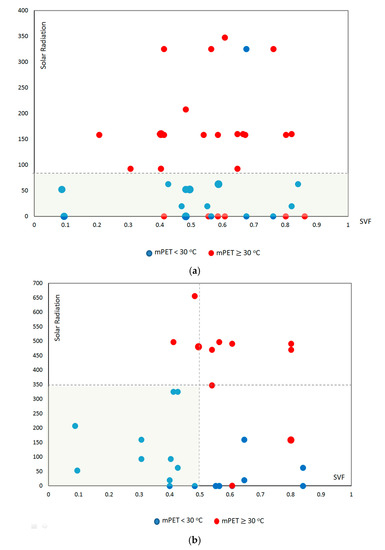 In Figure 14a, the correlation of mPET ≥ 30 °C/mPET < 30 °C for runners was seldom related to higher/lower SVF but more connected to higher/lower solar radiation. This addressed the fact that the higher solar radiation would mostly contribute to the risk of having thermal discomfort (mPET ≥ 30 °C). For walkers, the correlation between solar radiation/SVF and mPET is shown in Figure 14b. The values of mPET < 30 °C were located at the lower solar radiation/SVF area, while mPET ≥ 30 °C was distributed mostly at the higher radiation/SVF area.