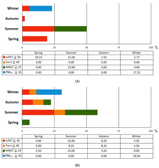 As seen in Figure 15a,b, by estimating the percentage (%) of having thermal indicators over the thresholds during running events, the risks in having thermal discomfort for runners and walkers were determined. Furthermore, the discomfort situations were defined here as (1) mPET ≥ 30 °C, (2) Tmrt ≥ 40 °C, (3) WBGT ≥ 25 °C, and (4) PM2.5 concentration ≥ 35 μg/m3. As a result, autumn running events are the most appropriate for runners, while spring running events are most appropriate for walkers. Due to the extreme high temperature conditions, the organizers even initiated the event in the early morning for reducing the discomfort caused by heat; the summer event was no doubt the least suitable one for both runners and walkers regarding thermal comfort.
