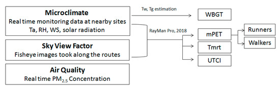 By providing the real time air temperature, relative humidity, wind speed, global radiation, and the SVF taken at sites among the four running routes by time, a RayMan Pro model was used in this study for estimating PET, mPET, Tmrt, and UTCI [23,24].