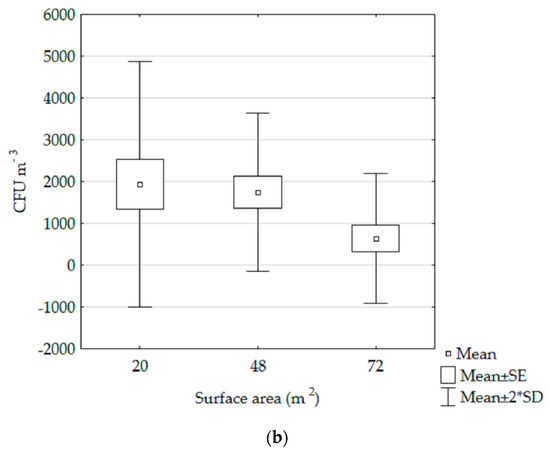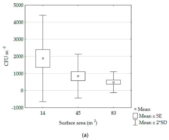 In both schools, the concentration of heterotrophic bacteria was correlated with the size of the studied rooms (Figure 1a,b). In rooms with a smaller surface area (the cafeterias), the concentration of heterotrophic bacteria was higher (School A: r = −0.63, p = 0.005; School B: r = −0.52, p = 0.025). A negative relationship was also observed for staphylococci (School A: r = −0.14; School B: r = −0.36), but the results were not statistically significant. On the other hand, the concentration of molds was not correlated with the size of the rooms in neither of the schools (r < 0.1, p > 0.05). The air temperature was similar in all the investigated rooms in School A and the same, in School B. (Table 1). Therefore, this factor did not significantly affect microbial concentration.