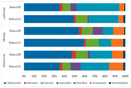 In the investigated schools, Cladosporium prevailed in fungal bioaerosol at the majority of the sampling sites. Their highest concentrations were recorded in the libraries of both schools: School A (59%), School B (54%), in the classroom in School B (47%), and in the cafeteria in School A (50%). Lower concentration—i.e., 35%—was noted in the classroom in School A and in the cafeteria in School B (Figure 2). The exception was the cafeteria in School B, dominated by Penicillium spores accounting for 42% of the fungal bioaerosol. They had a slightly smaller share in the cafeteria in School A (30%), in the classroom in School A (28%) and in the classroom in School B (22%). In the library in School A, Penicillium had a share of 12% and in the library in School B (10%) (Figure 2).
