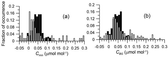 Minimum measured (Cmin) and background NH3 concentration (CBG). The distribution of daily Cmin (a) and daily mean CBG derived from the backward Lagrangian Stochastic (bLS) emission model (b) is indicated for the IN (black) and WI (white) dairies.