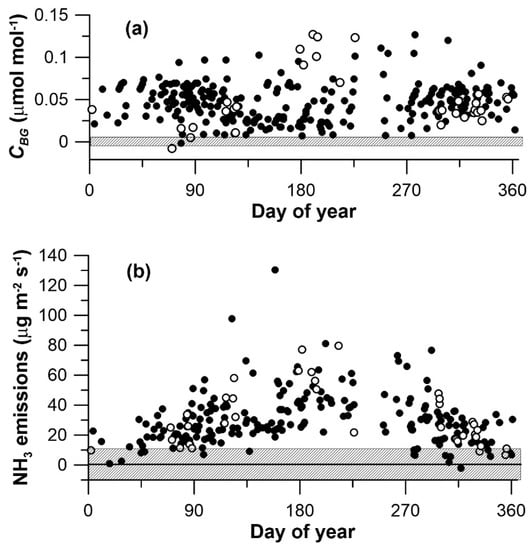Estimates of the minimum detection limit (MDL) of the bLS and VRPM emission methods were based on median concentration values rather than mean concentrations to minimize the influence of the non-normal concentration distributions (Figure 2). The MDL for the bLS emission method was estimated based on calculated emissions when the storage surfaces were frozen (Table S1). The median daily mean CBG (bLS-derived) was slightly higher at IN (0.047 µmol mol−1; 36 µg m−3) than at WI (0.040 µmol mol−1; 30 µg m−3). The corresponding median daily NH3 emission determined by the bLS model was 10.4 µg m−2 s−1 for the WI basins and 15.3 µg m−2 s−1 for the IN lagoon. The MDL for the VRPM method was estimated assuming a constant profile of the Cmin (which would occur when there was no emission from the surface) when the surface was frozen. This corresponded to a VRPM MDL of 10.3 µg m−2 s−1 for the WI basins and 15.6 µg m−2 s−1 for the IN lagoon. The mean MDL for the combined VPM- and bLS-determined daily emissions was 10 and 13 µg m−2 s−1 for the WI basins and the IN lagoon, respectively.