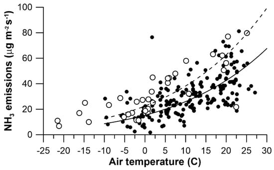 Air temperature, used as a proxy for the surface manure and lagoon temperature, was clearly related to the daily NH3 emissions at both the WI and IN dairy manure storage facility (Figure 4). The exponential diffusion function of temperature (Equation (1)) accounted for 58% (adjusted R2 = 0.58) of the variability in NH3 emissions at the WI basins and 41% (adjusted R2 = 0.41) of the variability in NH3 emissions at the IN lagoon. The emission response to temperature at the IN lagoon agreed with most prior studies [5,29]. Based on the temperature response, the surface crusting of the WI nonfrozen slurry storage did not appear to restrict emissions in a similar manner as that found for a heavily crust untreated raw manure storage [5]. The fraction of explained variability in emissions at these two dairies was similar to that reported for anaerobic lagoons at OK hog operations [27].