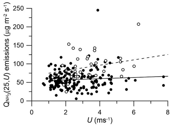 To minimize the influence of differences in site-specific turbulent mixing on the measured NH3 emissions, the temperature-normalized NH3 emissions QNH3(25,U) (Equation (2)) were linearly regressed on U as a measure of the atmospheric mixing. A normalized emission minimizing the influence of both temperature (Tair = 25 °C) and wind conditions (U = 2 ms−1) was defined as: