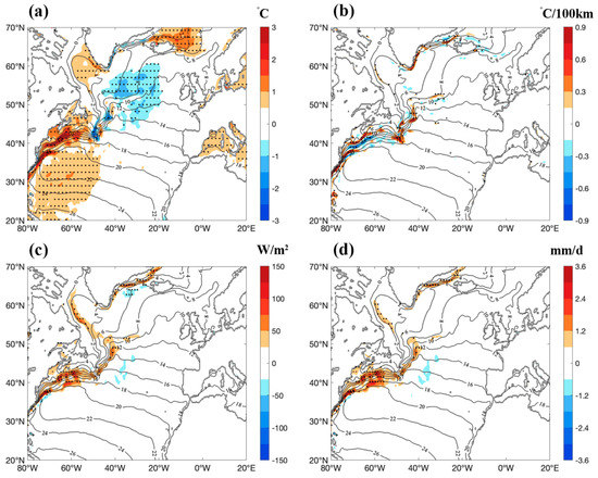 The change in SST fronts in the GS extension region includes a meridional shift of the path, adjustment of the SST gradient, and modification of the absolute SST values in the front region. The meridional shift of the front influences the synoptic atmospheric variability by modifying the low-level baroclinicity, poleward transport of moisture, and heat, resulting in a shift in storm tracks [4]. Comparative experiments on atmospheric models forced by high-resolution SST and smoothed SST suggest that the increase in the SST gradient influences upper-level latent heat release and enhances ECs [5]. The strength of the storm track was reported to be more sensitive to perturbations in absolute SST value [6]. This was further proved by Vries et al. [7] simulating storms passing through SST fronts. Their work suggests that the SST perturbation regulates surface latent heat flux, low-level baroclinicity, and upper-level diabatic heating to affect the strength of storms. SST variation north of the front can also change the land–sea contrast and air–sea stability, which is also important to surface storm track activities [8]. These works confirmed that a change in SST absolute value in the front region is more important to EC’s strength than the SST gradient.