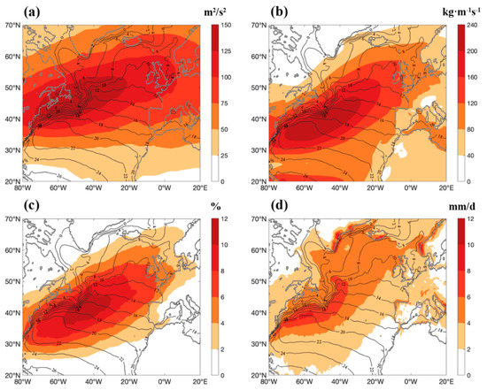 The time mean IVT is mainly distributed south of the SST front, along the southern edge of the storm track (Figure 4b). This is reasonable because high IVT filaments (ARs) are mostly distributed at the southeastern part of an EC as they are generally related to the low-level jet stream ahead of the cold front [24,33]. From the 6 h vertical integral of eastward and northward water vapor flux, we calculated AR frequency using the AR detection method in Section 2. We detected a total of 13,000 + ARs (from the data with 6 h intervals) in the North Atlantic region in 1997–2019. The maximum AR frequency was over 10% of the total temporal period (Figure 4c). The maximum frequency was mainly in the south of the GS front and consistent with the IVT maximum. The pattern of AR frequency agrees with former studies [23,46,47,48]. The distribution of a large precipitation zone in mean state (spread along the warm sector of the front, Figure 4d) agrees with the maximum AR frequency, suggesting a close relationship between ARs and rainfall. We noted that there are high-precipitation regions spread along the northern and eastern boundaries of the North Atlantic (for example, the coast of Greenland, Iceland, and continental Western Europe), which might be related to the landfall of ARs in these regions.