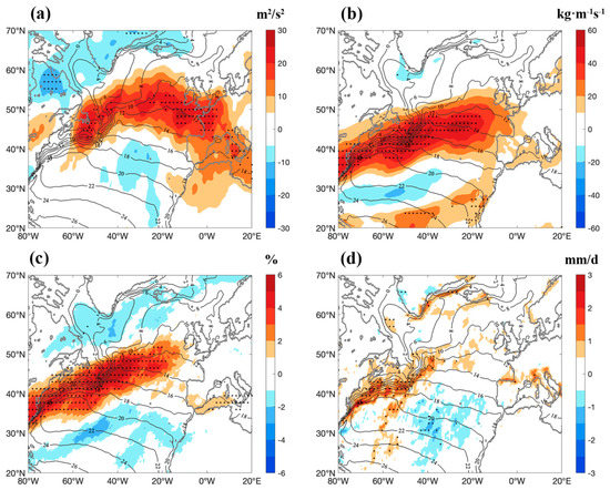 To investigate the effect of the warming SST in the GS front on storm track and ARs, firstly we checked the mean state and the trend of EKE and IVT in the North Atlantic. We used the meridional wind component derived from 6-h ERA5 data after 2–15-d bandpass filtering to represent the EKE of synoptic variations. The maximum EKE region is distributed along the GS front, spread toward the eastern coast of the Atlantic (Figure 4). The mean value (about 150 m2s−2 on the GS front) and the pattern of EKE agree with former studies [24,43,44]. There is a significant positive EKE trend over the GS front and along the North Atlantic Current. The EKE increased about 20–30 m2s−2 in 23 years, which is over 10% of the mean, indicating the locally strengthened and eastward expansion of the storm track in the North Atlantic (Figure 5a). This local strengthening is consistent with the theory of Booth et al. and Small et al. [6,8] that the strength of the storm track is more sensitive to SST value. The eastward expansion of the storm track agrees with former results from numerical experiments with CESM1 in Ciasto et al. [45]. In their Figure 4, the VV200 response in RCP85 (2080–99) displays an increase in the downstream storm track in the experiment with SST difference (the pattern is positive south of 50° N and negative north of 50° N), similar to our SST trend.