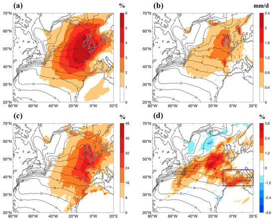 (a) Mean AR landfalling frequency during 1997–2019 (%). (b) As in (a) but for landfalling AR related rainfall (mm/d). (c) Ratio of landfalling AR-related precipitation to total precipitation (%). (d) Increase of landfalling AR frequency (%). Contours are mean SST between 1997 to 2019 (°C). Black dots mark the region in which the trend passed the 95% significance level. The blue box in (d) shows the region (10° W–20° E, 35° N–44° N) used to calculate the regional averaged precipitation in the Iberian Peninsula and the Mediterranean Sea region.