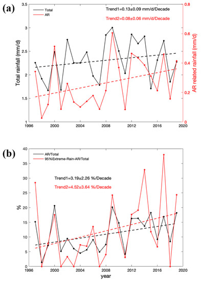 The landfalling AR-related rainfall is shown in Figure 6b. The heavy rainfall is mainly located on the western coast of Europe and southern coast of Iceland, in agreement with former studies (such as Waliser and Guan, and Mattingly et al. [46,51]). Compared with the total rainfall, AR-related precipitation contributes almost half of the total (Figure 6c), which agrees with the findings of Lavers and Villarini [52]. From Figure 6d, after 1997, the frequency of landfalling ARs increased, primarily in the Atlantic in 30–20° W and in Western Europe. We noticed a significant increase in landfalling AR occurrence in the Iberian Peninsula and the Mediterranean Sea over the 23 years. To inspect the relationship between total rainfall and AR-related rainfall, the variations of the two, averaged in the Iberian Peninsula and the Mediterranean Sea region (the blue box in Figure 6d), are plotted in Figure 7a. Although the averaged total rainfall does not have a significant trend between 1997 and 2019, the landfalling AR-related precipitation has a significant positive trend of 0.08 mm/d/decade in that region. From 1997 to 2019, with the increase in the landfalling AR frequency, the proportion of landfalling AR-related rainfall over the total increased about 5% (Figure 7b), while the AR-related extreme rainfall (higher than 95th percentile) increased even more (5–10%). This proved the importance of AR’s landfalling on extreme precipitation in Western Europe.