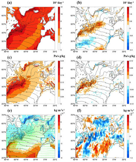 As the forming of ARs is related not only to ECs but also to moisture, we also checked the upward water vapor flux (<wQ>). From Figure 8c, we see that the water vapor flux maximum is distributed along the warm sector of the GS front, which is related to the strong evaporation, wind convergence, and vertical flow over the front. There is a significant positive trend of water vapor flux along the GS axis (Figure 8d), showing that the increased SST increases the baroclinic instability and the moisture content in the atmosphere (which agrees with Jia et al. [54]). VIMD is a parameter with a positive value for moisture diverging and a negative value for concentrating. In an AR, VIMD is mainly negative because of the convergence. The pattern of VIMD and its trend is shown in Figure 8e,f. The mean vertical integrated water vapor flux generally flows from southwest to northeast, with a divergence south of the GS front and convergence north of it. This is because of a larger air-sea temperature difference over the warm sector of the SST front, which enhances evaporation, while the cold sector of the front induces condensation. The negative VIMD along the continental coasts indicates rainfall in these regions, in agreement with the precipitation trends in Figure 4d. The trend of VIMD is negative along the GS front, which is a result of the increased AR occurrence. We also noticed negative VIMD in the Mediterranean Sea region, in agreement with the increased precipitation related to ARs.