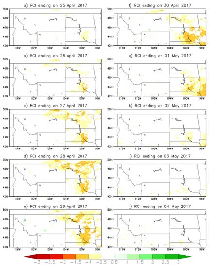 Figure 1 shows an example of daily RCI maps calculated using 7-day mean ET anomalies from 25 April to 4 May 2017, right before the onset of the Northern High Plains flash drought on 23 May 2017. On 25 April, a small area of negative RCI appeared over the Central South Dakota. The RCI in this area continued to decrease/intensify and expanded into North Dakota from 26 to 29 April. The RCI then started to increase and gradually disappeared in the region from 30 April to 4 May. This type of drought development signals is also observed in other ET-based drought indices, such as the evaporative demand drought index (EDDI) [