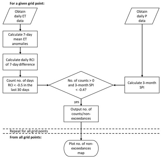 To help retain the signals and to create an intuitive drought prediction map that directly depicts drought tendency as the MDO, we used a threshold method and counted the number of occurrences that RCI was less than −0.5 over the last 30 days. For a given grid point, if RCI remains less than −0.5 for multiple days, it indicates that 7-day mean ET anomalies persistently decrease throughout those days, and thus the higher the count the more likely drought is to develop. However, persistent decreases of 7-day mean ET anomalies can occur after a heavy rainfall event or during temperature decline and do not guarantee drought to develop. Chen et al. (2019) [