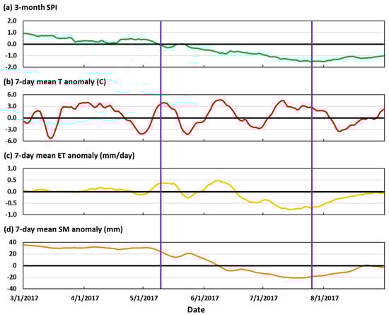Figure 1 from 1 March to 31 August 2017. In springtime, temperatures in this region were much above normal for an extended period, melting a large portion of snow on the ground and recharging soil moisture. During spring 7-day mean ET anomalies were about average due to cool temperatures, while 3-month SPI decreased from around positive one to near normal. Prior to the drought onset on 23 May, a heatwave struck the region and activated strong ET processes. Simultaneously, 3-month SPI dropped below zero, resulting in a sharp decline in 7-day mean SM anomalies and contributing to the flash drought. In June, another heatwave hit the region and caused anomalously high ET rates. Accompanied by a continued lack of rainfall, 7-day mean SM anomalies fell steeply, becoming more negative. In July, although the region suffered from a third heatwave, 7-day mean ET anomalies remained negative because of the large deficits in both 7-day mean SM anomalies and 3-month SPI (i.e., there was insufficient SM to support anomalously positive ET activities). At that time, the exceptional drought (D4) was well established.