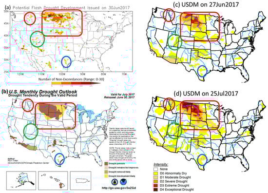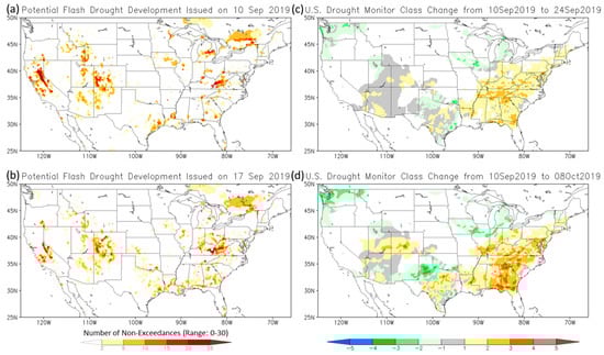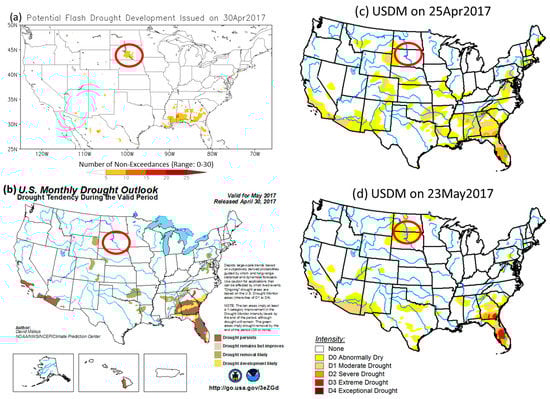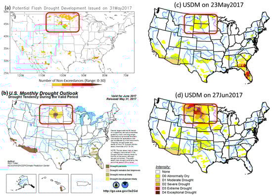 Figure 4a shows the potential flash drought development issued on 30 April 2017. In the map, yellow-to-red colors indicate areas with potential drought development or intensification. The higher the number of non-exceedances, the more likely for drought to develop or intensify. It captured the drought onset signals over the Dakotas and the development signals over the Southeast. This prediction was verified by the changes from the USDM on 25 April compared to 23 May 2017 (