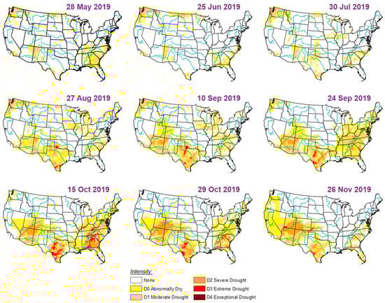 Figure 7l), and this prediction was verified by the USDM class change map from 29 May to 26 June 2018 (