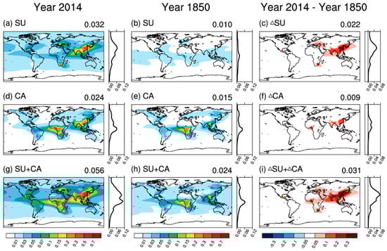 Figure 1 shows the comparison of spatial distribution of the modelled annual average AOD in sulfate and carbonaceous aerosol between the years 2014 and 1850. Obviously, the sulfate and carbonaceous AOD increased significantly in the year 2014 relative to the year 1850, which can be attributed to the large emissions of anthropogenic aerosols (e.g., BC, OC) and sulfate precursor (e.g., SO2). The high values of sulfate AOD (>0.2) are mainly located in East Asia, South Asia, South Africa, and their downwind direction in the year 2014 (Figure 1a), corresponding to the areas with the strong increased sulfate AOD (Figure 1c). The high values (>0.2) of carbonaceous AOD can be mainly found in East Asia, South Asia, Central Africa and their downwind direction in the year 2014 (Figure 1d), and East Asia and South Asia contribute the most in the increased carbonaceous AOD (Figure 1f). For the natural aerosols (i.e., dust and sea salt), their distributions of AOD values change little (not show), whereas the dust global mean AOD decreases about 2% in the year 2014. This very weak decrease is also found in the Grandey et al. 2018 [], which may be due in part to there is relatively little change in the surface temperature with the fixed SSTs, so there would not be expected to be much of a change in dust emission []. In sum, the total AOD (global mean, 0.111) in the year 2014 increases about 39% (0.031) relative to the year 1850 (global mean, 0.08). The sulfate AOD contributes to about 71% (0.022), and the carbonaceous AOD contributes to the remainder 29% (0.009) (Figure 1c,f,i). The increased species AOD concentrates most in the Northern Hemisphere (NH), especially in East Asia and South Asia.